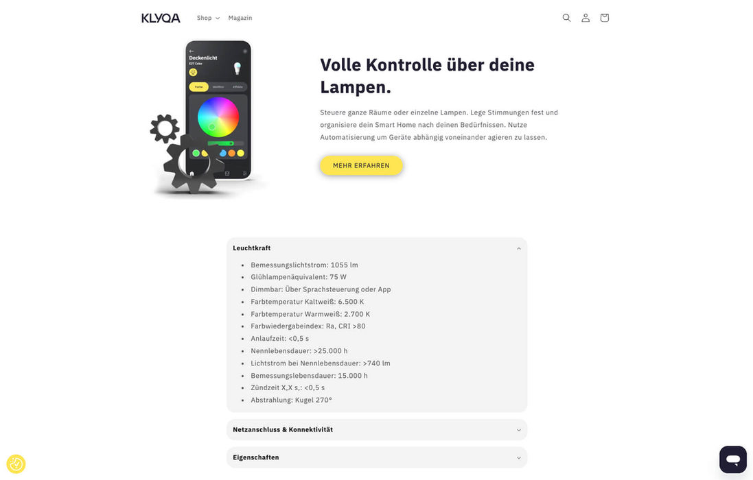 KLYQA ist ein innovatives Unternehmen mit einem klaren Fokus: der Bereitstellung erschwinglicher und klimafreundlicher Smart-Home-Optionen. Das ausgeklügelte Smart-Home-Modul von KLYQA gestattet das Zusammenschalten mehrerer Geräte sowie eine Kopplung mit gängigen technischen Sprachassistenten. KLYQA steht somit für einfache, weitreichende Lösungen und wendet sich an ein breites Publikum. Mit unserem umfassenden Service unterstützen wir das dynamische Unternehmen sehr gerne bei seinem weiteren Wachstum. Wir übernahmen die technische Umsetzung der Shop-Anbindung an eine durch uns installierte und adminstrierte JTL-Warenwirtschaft sowie, ein Update der bestehenden Plattform auf die neueste Shopify-Version.